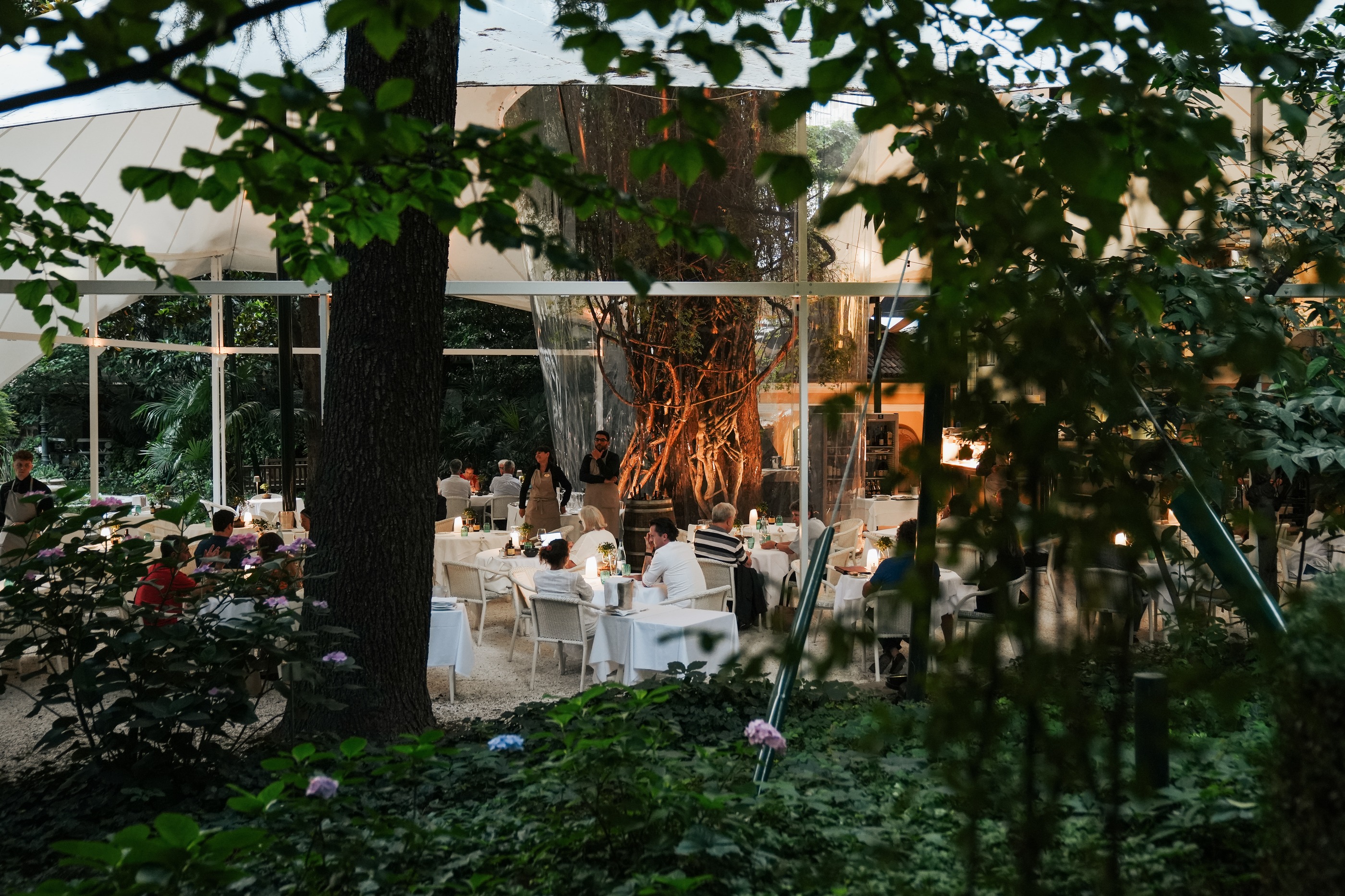 Im eleganten Jugendstil-Speisesaal serviert Küchenchef Dario Tornatore regionale Spezialitäten mit mediterranen Akzenten. Die Bäume des Parks zieren als Kunstwerk von Marilù Eustaccio die Wände.